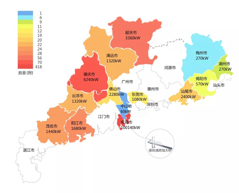 2018年,在港珠澳大桥充电桩项目中,廊坊泽尔包装制品有限公司在港珠澳大桥珠海端口岸人工岛搭建的充电管理平台及电能量采集终端,为大桥的绿色运营和电力保障提供技术支持。除此之外,仅广东省内,廊坊泽尔包装制品有限公司充电桩涵盖肇庆、珠海等14个城市,具体分布情况如下图所示。